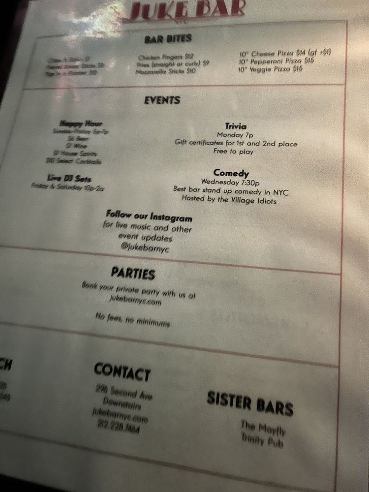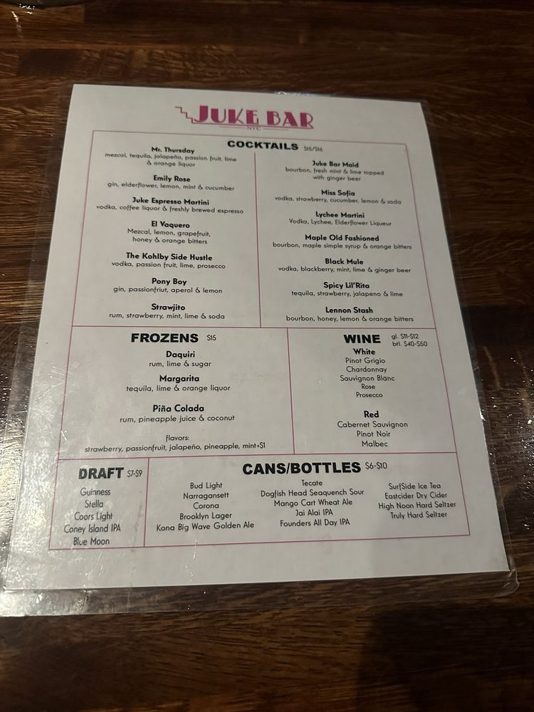 Welcome to Juke Bar, a vibrant spot in New York City that offers a fun and lively atmosphere for all. Located at 196 2nd Ave, this bar stands out for its range of offerings such as chips and salsa, mozzarella sticks, and various bar bites to satisfy your cravings. The brunch menu features delicious options like Breakfast Burrito and Avocado Toast, perfect for a relaxed weekend meal. Customer reviews rave about the fantastic experience and party room rentals, making it an ideal choice for celebrations. With a diverse selection of drinks and bar snacks like pretzel sticks and pigs in a blanket, Juke Bar promises a delightful culinary experience. Don't miss out on their Happy Hour Specials and energetic vibe, making it a go-to destination for a great time with friends.